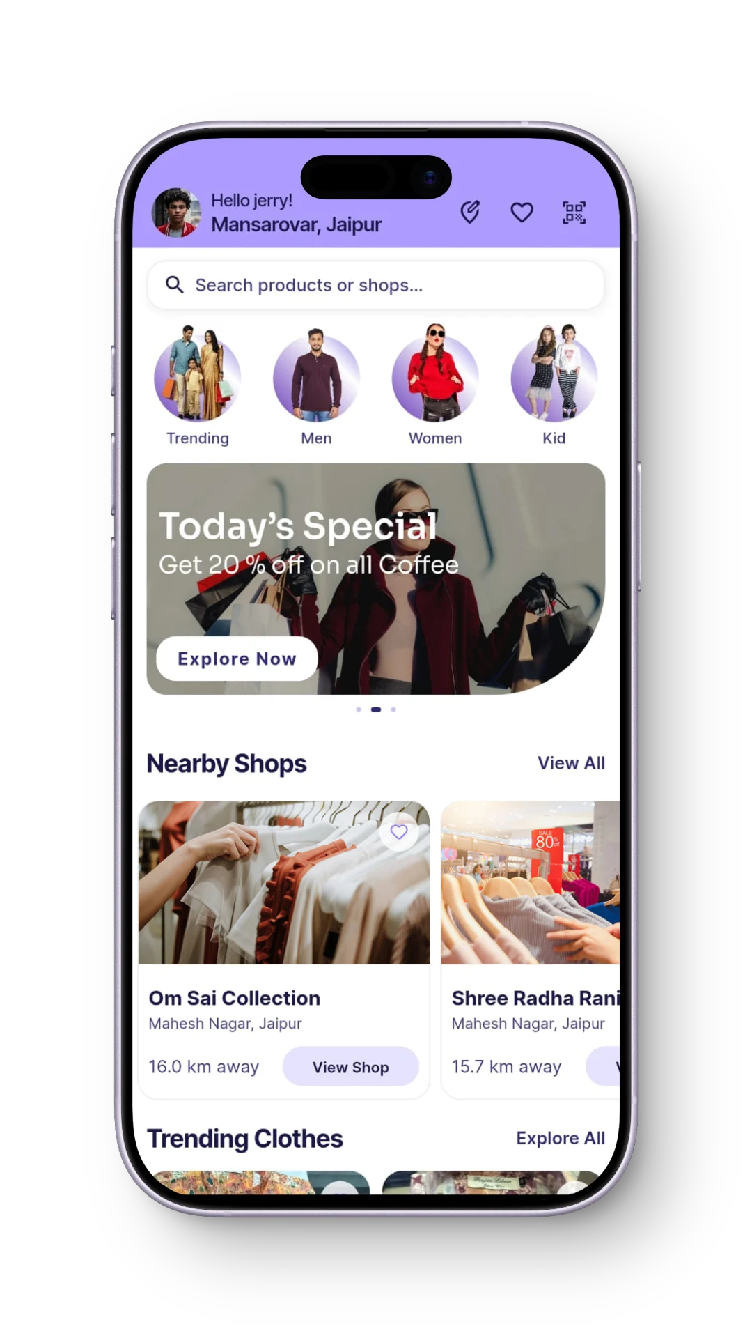 Explore hundreds of nearby shops by category — clothes, footwear, accessories, and more. Filter by distance and price.